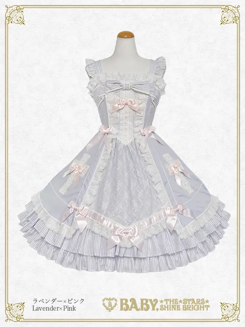 ストライプ地フリルやレース地にたくさんのおリボンをあしったお上品なBABY定番ジャンパースカートが久々に登場です♪